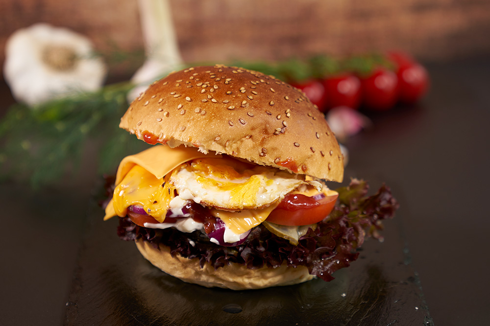 Mit Spiegelei⁶, Zwiebeln, Tomate, Gewürzgurke¹´², Salat und Käseᵈ